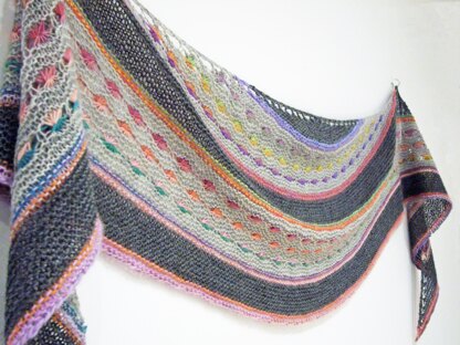 Jewel is a soft crescent shaped shawl that uses a long colour change yarn to adorn the shawl with jewels of colour. A rhythmical knit, with colours that evolve as you go, slowly revealing the final piece. With so many stunning long colour change yarns to choose from the possibilities are endless. This shawl is suitable for adventurous beginners, intermediates and experts alike, and takes around 20 hrs and less than 150g of yarn to knit.
