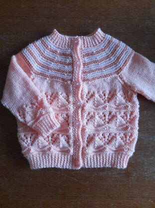 Lace toddler cardigan, age 12-18 months, chest 20-22". Actual size (approx), chest 24", length 12" , sleeve 8" Knitted in one piece to wormhole in a lace and bobble pattern with circular garter stitch yoke. Can be knitted in one colour or optional contrasts in yoke.