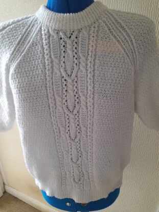 Adult jumper knitted in 4ply yarn with raglan sleeves and patterned panels on front, back and sleeves. Actual measurements - chest 41”, length 20”, sleeves 7”