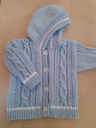 Baby hoodie in stocking stitch with cable and bobble panels, worked in one piece to armhole, age 6-9 months, chest 18-20". Actual measurements chest 20", length 10", sleeve 6.5"