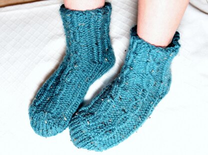 Made for my friend Jodi Cable (no lie!), these comfy and stylish slipper socks feature a combination of rib and mock cable stitches and use German short row shaping for the heel and toe. I learned the basics of German short row shaping from project notes and photos done by Brenda Myers which she did based off a [needle knit technique which you can view here][1].