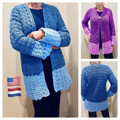A two toned cardigan...just what your sweater collection needed! Easy stitching : Chains, SC and DC make up this lovely cardigan. Which makes it beginner friendly. A unique item made by you!