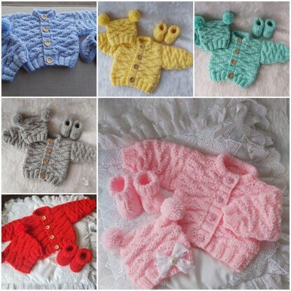 John Joe, like most of my designs, is a unisex knit. This is a lovely thick knit to keep your little ones warm during the winter or ideal for the school run. Pattern comprises of Jacket, T-Bag Hat and Booties.