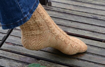 Ideally suited to a semi-solid or solid sock yarn, this is a project to conjure autumn nights: long evenings in front of a fire, with a special fibre in a jewel-like colourway. The finished item is elegant and richly textured, whether worn hidden in your winter boots, or on show.