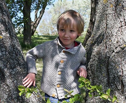 This modern and timeless cardigan is knitted from the the top down, seamless, with a beautifully worked reglan and an asymetric buttoning. Sleeves are worked in stockinette stitch to balance the double seed stitch body and its large collar will warm up your little fellows!