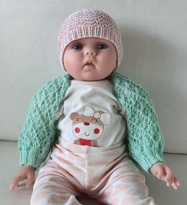 This 4ply baby’s shrug has 2x2 rib cuffs then is worked in a lovely lace stitch. As there is no shaping required when working the lace stitch, this shrug is easier to knit than it may look, and is a perfect project for gaining confidence for knitting lace stitches. It is photographed in size 0 months.