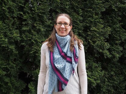 Jovial is a playful, light-weight shawl. The shawl is worked in three colors, each with its own stitch pattern, adding another layer to the color blocks and stripes. It can be as bold or as subtle as you wish – a band of merry and bright colors or a combination of soft and mellow ones.