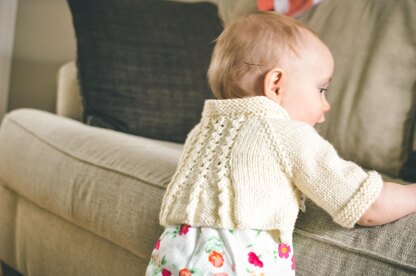 Joyal is a feminine open cardigan/shrug, and has a lace back panel. This will be just as cute with a pair of jeans, as it will over a fancy dress. You have the choice of either long, ¾ length, or short sleeves, and this is knit top down. The lace is charted and written out.