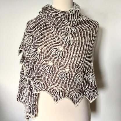 This shawl was created for the wedding of a very special friend. The flower motif echoes a pattern from her dress and the name 'Joyous' represents my wishes for her married life.