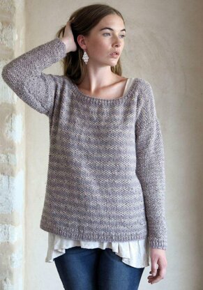 This textured lightweight sweater is worked in a Moss Stitch stripe pattern with contrasting yarns. The sweater has a soft rib on the bodice, cuffs & neckline. The neckline is wide and scooped, the bodice is wide and the sleeves are narrow.