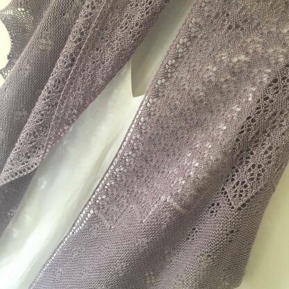 Worked from just one skein of this beautiful lace weight yarn, this shawl is a joy to knit and elegantly stunning to wear. The pretty lace motif is a short pattern repeat and easy to memorise. Worked top-down from a garter stitch tab, I designed the concentrated lace pattern to be worked on the shorter rows, then the long rows of the garter stitch border act as a therapeutic rhythm leading up to the prettily fluted edging. Blocking releases the true beauty of the Merino/Silk blend, with the faint shimmer of silk adding subtle charm and beauty. This shawl is a lovely size for a Summer drape which wraps generously round the shoulders in uncluttered beauty - perfect for Garden Party chic and Wedding elegance.