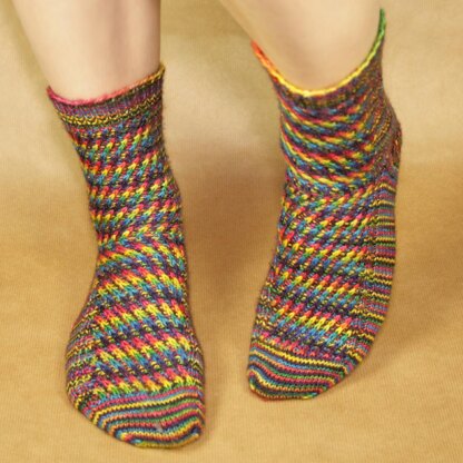 Slipped stitches and tiny cables combine to give a great effect in variegated yarns. Ribbed columns are worked down the sides of the leg and foot to achieve a super fit. Socks are worked from the top down with an afterthought heel.
