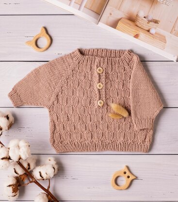 Jumper is seamless and realized both in flat and in the round. Upper part (till placket joining) is knitted flat, down one and sleeves are realized in the round. The front is decorated with fantasy pattern, placket sides can be joined with 3 buttons.