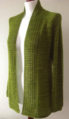 Juneberry Cardigan is worked top down in one piece, including the collar. It has a slight A-line which creates a nice flowy shape. The lace collar is wide enough to overlap in the front on colder days.