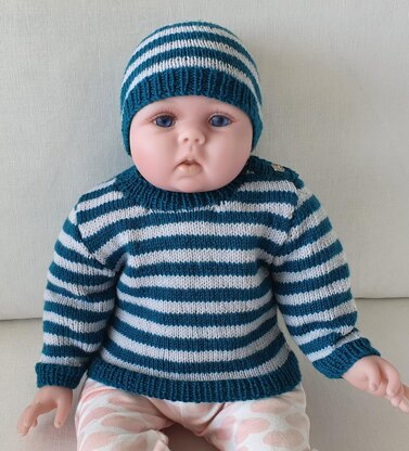This easy knit, striped, 4ply jumper has a round neck, set-in sleeves and buttons at the shoulder making it easy to get on and off. The matching beanie features stripes and a rib brim. The set has been photographed in size 0 months.