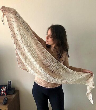 The Jupiter Shawl is a relaxing asymmetric shawl pattern, in a combination of stripes in garter stitch and lace, starting from your upper right tip and worked sideways towards the left edge.