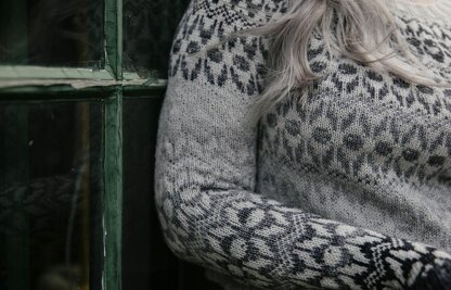 Juxtaposition is worked top-down seamlessly. The sweater has a round yoke and an all-over colorwork pattern. The sweater has long sleeves and no waist shaping. The hem is cropped. Because of the colorwork there’s no bust dart but you can easily lengthen the body of the sweater. You can use a separate MC and CC but the look of the sample was achieved using a gradient, starting MC from the light end and CC from the dark end.