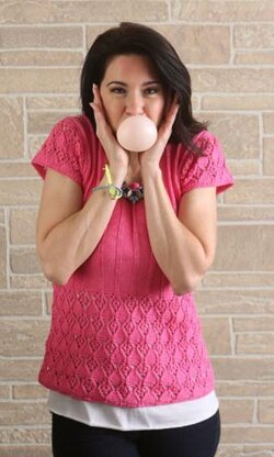 This beautiful summer top has a beautiful lace pattern at the bottom edge, the rest of the body is worked in a ribbing pattern created by the lace pattern itself. Decreases are taken out for the waistline on the sides. The top has a wide round neckline. The short, modified drop shoulder sleeves follow the lace pattern.