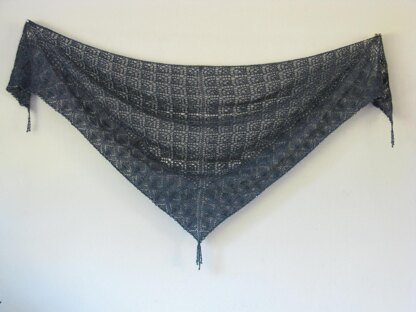 This gorgeous triangular shawl is worked from the neck down. It follows a beautiful lace pattern then transitions to a wonderful border. A metallic thread is held together with the yarn throughout the project adding to the dramatic look of the shawl. The bottom edge is decorated with crystal beads to add to the beauty of the design and add weight to the bottom edge, allowing the shawl to stretch out and show the full pattern.