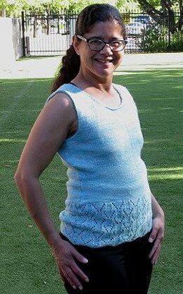This is a sleeveless top with wide round neckline. The bottom edge of the top is worked in a beautiful lace pattern that creates its own scallops as it is worked. The waistline of the top is shaped, creating a feminine look. The armholes and neckline are finished with applied I-cord. However, an alternative for finishing with k1, p1 ribbing is also offered.