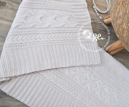 This blanket is simple and elegant. Has a cable pattern with stocking stitch and rib borders. Charted and also fully written instructions. Pattern also comes with a little pair of boots to keep bubs feet toasty warm. A suitable yarn would be Paton's Merino Extra Fine.