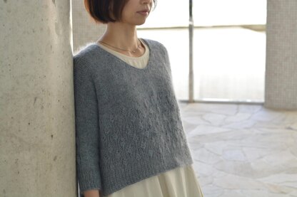 “Kaga”, flower bud in Japanese, is a V-neck pullover with hi-lo slit hem, Kaga Cardigan and Kaga Shawl are sister designs. First, the right and left saddle shoulder panels are worked separately with Kaga pattern, then stitches are picked up for the back and front along the panel edges. German short rows are used to shape the shoulders, then the front and back of the pullover are worked back and forth separately to the underarm. They are joined to be worked in the round in one piece, then Kaga pattern is worked over the lower body. The hems are split and worked back and forth. Sleeves are worked top down in the round after the body is finished, with Kaga pattern running down from the shoulder saddles.