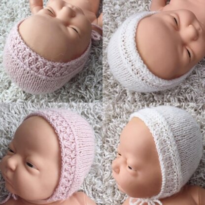 This is a downloadable PDF pattern for the knitting of this Kairi and Kenn bonnets in newborn/21-22 inch reborn size SIZE and NOT the actual finished items