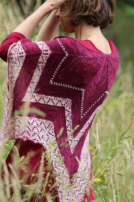 Kaleidos is an elegant star shaped shawl. Worked from the nape in radiating wedges, it has lace panel inserts that form kaleidoscopic patterns at the increase and decrease lines within the star shape.