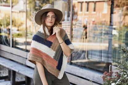 Bold, cascading stripes created with a simple log cabin technique accent this classic poncho silhouette for a striking look. Crochet is king this fall and this topper is the perfect transitional piece into winter weather.