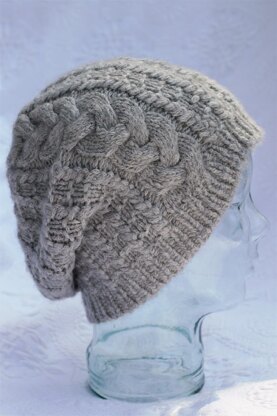 Twisted is made using a chunky/bulky weight chainette yarn. It can be made into a regular beanie, slouchy beanie, or beret depending on the number of row repeats and method of blocking.