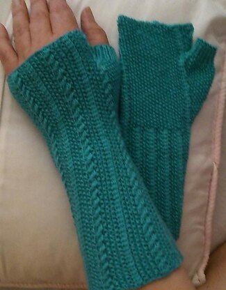 Simple cabled fingerless mitts in one size that accommodates a range of hand sizes due to the elasticity of the design, knit from cuff to fingers. The shaping on the cuff means the mitt hugs the inside of the wrist and is less likely to get in the way if you wear them while working. Cuff and finger length is adjustable to your preference.