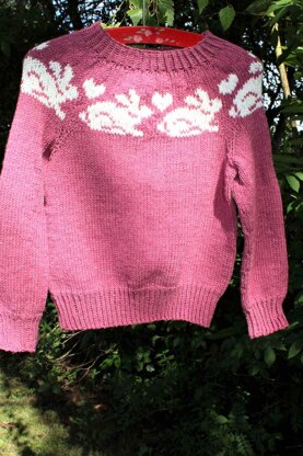 Kaninus sweater/pullover is worked from the bottom edge and up with a 2-color pattern on the yoke. The sweater has a combined round and raglan yoke and sleeve construction and traditional rib edges. The pattern is made for at yarn with a gauge of 26 stitches per 10 centimeters (stockinette stitch) i.e. a yardage of approximate 150 meters per 50 grams.