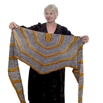 Thin bands of color radiating out from the middle of this triangular shawl are reminiscent of warm rays of sunshine in the late afternoon. How appropriate then, that ‘Karee’ is the aboriginal word for ‘Sun’. Constructed to begin at the center, this shawl is worked in three colors outward towards the tips.The geometric patterning formed by Karee’s narrow stripes, intersects in new and interesting ways each time you wear it wrapped and pinned differently.