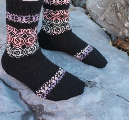 "These socks may look complex but they really are quite simple to knit! The Fair Isle sections are worked using self patterning sock yarn, so you are only working with two balls of yarn. But better still, the Fair Isle patterning is only worked on the foot and leg, where there is no shaping to contend with.