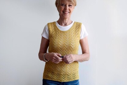 This is Katherine, a summery shell of Chevron Lace. This quick knit is figure-hugging and extends hip length. You’ll find its 9 stitch by 8 row stitch pattern repeat is easily mastered, creating just enough variety to keep the project interesting while flying off the needles. This design is worked bottom-up on circular needles, splitting at the armholes where it is then worked flat. A few Garter rounds from picked up stitches trim its edges. Shown in a fingering weight silk/wool blend, it's a perfect summer knit! Enjoy!