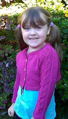 Katren is the tender-hearted character from [The Ancient Future by Traci Harding][3], a well-loved book of mine. When thinking of Katren, hearts come to mind, as she is a kind, sweet heart and the mother hen of the Chosen. Rags to riches, this cropped cardigan shows the elegance of being a lady with the practical long sleeves of a commoner. Designed to keep the chest and heart warm of your little one, the cute, single cable pattern extends down the arms to the cuff, showing everyone a mother’s love, just like Katren’s.