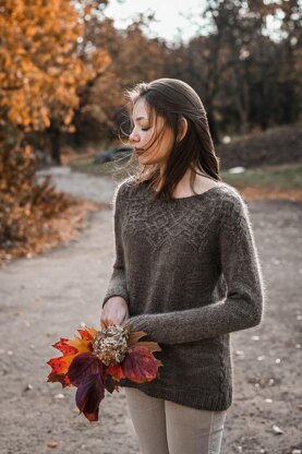“Kazka” sweater is worked from the neck down completely seamless. The circular yoke features a freeform cable pattern, which echoes in the side lace inserts creating the A-line shape of the garment.
