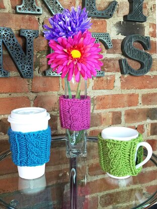 Keep your hot drinks cozy and warm with this adorable cable knit cozy! This cozy is perfect for everyday cups and mugs, and can even be used to adorn your household items. Knit with bulky weight yarn, this cozy knits up super quick, and is a great way to learn and practice the basic cable stitch. It is so quick and fun to make that you might find yourself making multiple cozies in different colors for your friends and family (I know I did!) This cozy is knit flat and then seamed after it is finished, giving you the option to leave space for a mug handle.