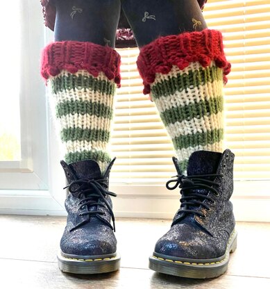 A pdf knitting pattern for cosy legwarmers in an elf design intended to be mid-calf length for adults, worn straight or with a slight slouch. Perfect for using up your left-over yarn to add a festive touch to outfits that will be totally unique! They will keep you toasty warm throughout the holidays!