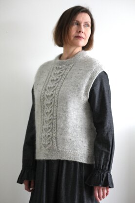Keisarinna Vest is worked from the bottom up in the round. Its front is decorated by jewlry-like cables. The shoulders of the vest are shaped with short rows for a perfect fit. The neck ribbing if folded in half, providing a carefully finished look.