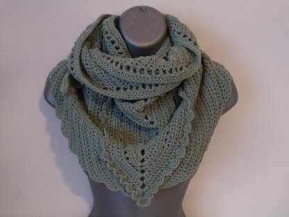 This shawl (shaped scarf/neckerchief) measures 180cm (pre blocking) and 200cm (post blocking) along the neck edge.