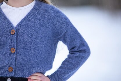 Kerttu cardigan is a simple stockinette stitch cardigan with drop shoulders and casual fit. It is worked from the top-down seamlessly starting from small back neck extensions that grow into button bands that are worked simultaneously with the cardigan. The version here is cropped but the length can be easily modified.
