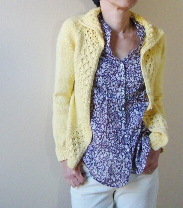 This cardigan is knit from the top down in one piece. It starts off the collar with the lace, which continuously flows to the fronts and the back. The collar is reversible, both sides are totally different yet equally beautiful. The button band is worked with body at the same time from the top, so that it will cover your neck as a cowl. Or you can leave out the button holes as an open front cardigan if you'd like.