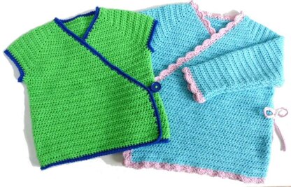 Kimono Wrap Revisited: a highly customizable crochet wrap pattern with sizes ranging from 3 months to 10 years and multiple options for finishing and closures. Make it in a camouflage variegated yarn or make a very girly version in pink with a picot or shell edging. Anything is possible!