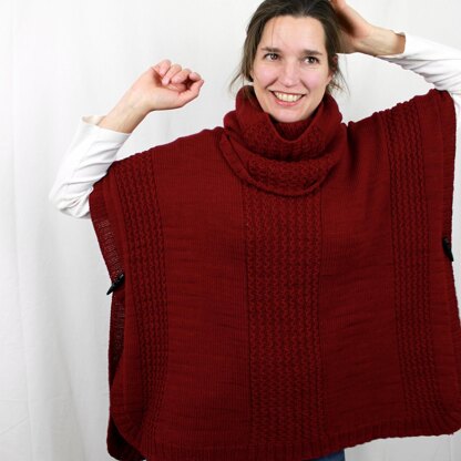 Kirsche is an oversized poncho that is worked from the bottom front hem around the shoulders and then down to the back bottom hem. The sides are held together by two buttons that are placed in the ribbing.