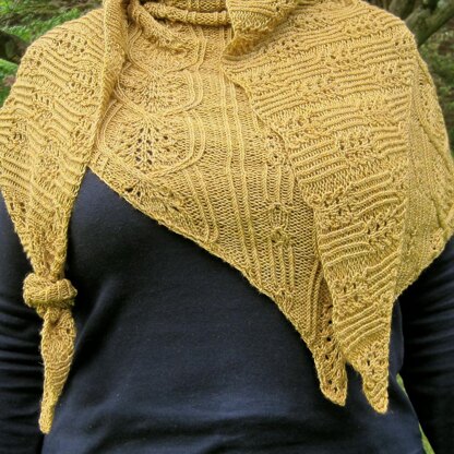 This lightweight triangular shawl incorporates three distinct Japanese lace stitches. It is knit top down, and the stitches cause a pretty and delicate scallop at the neckline. While the shawl looks difficult to knit, it is not hard, and is suitable for Intermediate knitters.