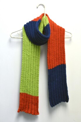 3 colours of chunky weight yarn, with at least 125 metres / 136 yards of each colour. The original scarf was knit with Estelle Yarns Chunky in French Navy, Papaya, and Apple Sour . For a similar look, try Willow & Lark Strath in Navy Blue, Logan Berry, and Reed Green.