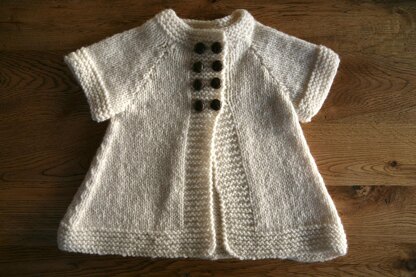The Kitekite Coat is a sweet and comfortable garment for babies and children. Each size features a double row of buttons to close the coat, and the back has a small gather that creates a series of soft folds over the lower back. This coat is designed to be worn with an inch of negative ease around the chest, but if you are unsure of which size to make based on the child's age, go up a size. There is nothing more disappointing that a hand knit that is too small to wear!