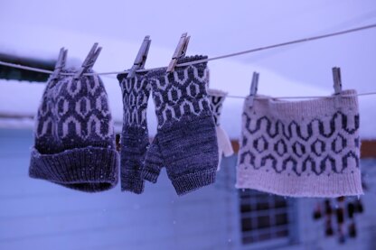 Yarn: 175–200 yards (160–183 meters) total fingering weight yarn in two contrasting colors; yarn usage from test knitters across all sizes ranged from 147–165 yards (134.4–150.9 meters) for the MC and 28–37 yards (25.6–33.8 meters) for the CC