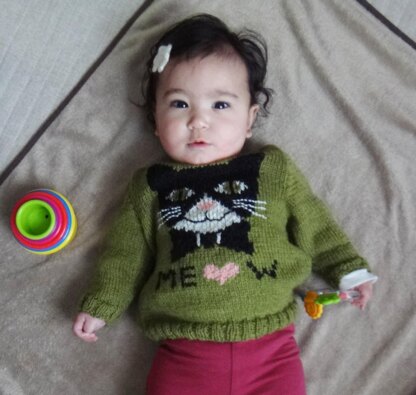 Cute crewneck sweater with intarsia kitty motif, sized from newborn to toddler.